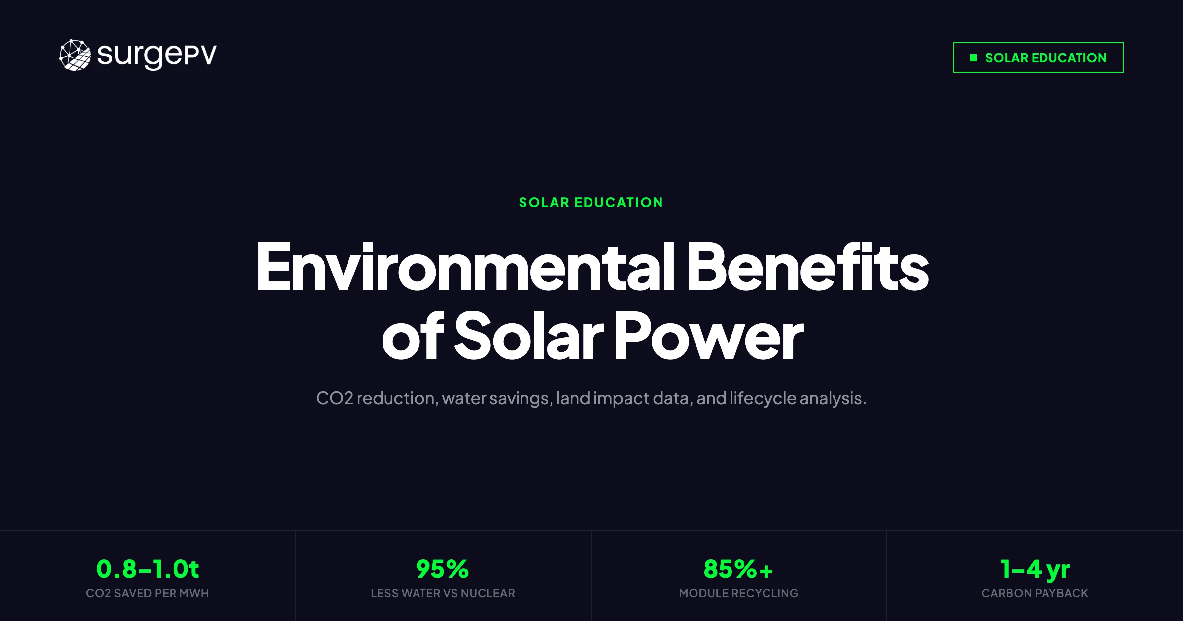 SurgePV’s proposal tool automatically calculates lifetime CO2 avoidance, carbon payback period, and water savings — formatted for client sustainability reporting. See it live in a 20-minute walkthrough.