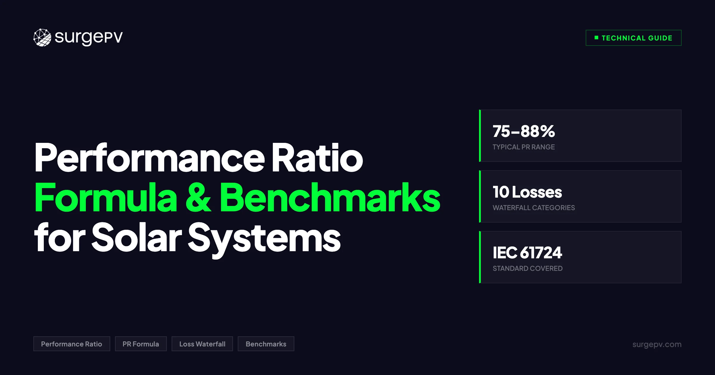This guide covers the IEC 61724 formula, worked calculation examples, benchmarks by climate zone, the complete loss waterfall, temperature-corrected PR, troubleshooting, and design-phase optimization strategies.