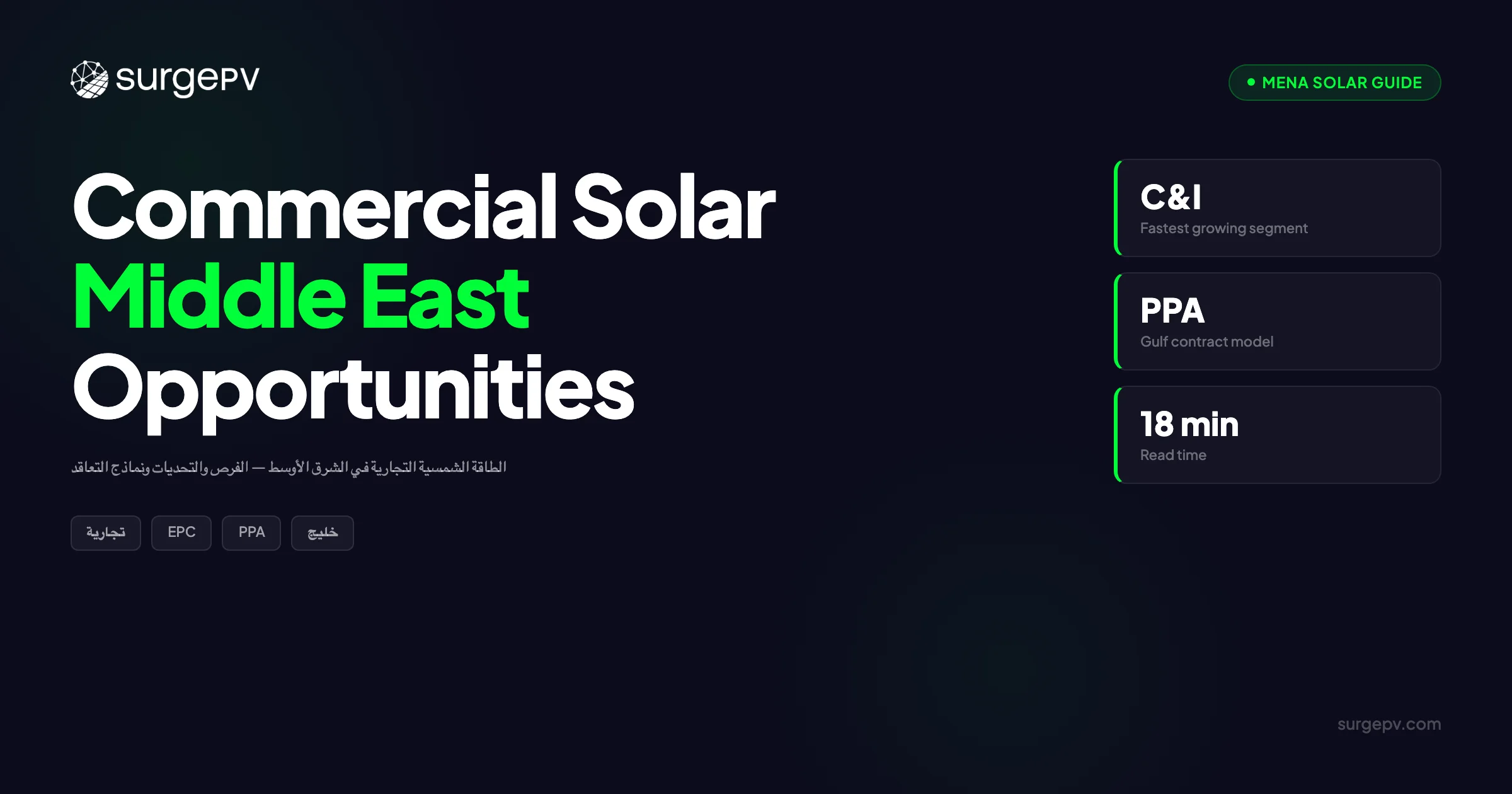 8.4 غيغاواط مركّبة من C&I في نهاية 2025، ونمو سنوي بنسبة 28%. المملكة العربية السعودية والإمارات ومصر والمغرب هي الأسواق الرائدة. التسعير التجاري يبدأ من 2.8 ريال/واط في السعودية و2.5 درهم/واط في الإمارات. نماذج PPA تكتسب زخماً في قطاع الضيافة والصناعة. أكبر عوامل الخطر: تأخر ربط الشبكة، ودعم الكهرباء في بعض الأسواق، وطول دورات الموافقة. برنامج تصميم الطاقة الشمسية المتخصص ضروري للفوز بالعطاءات المنافسة.