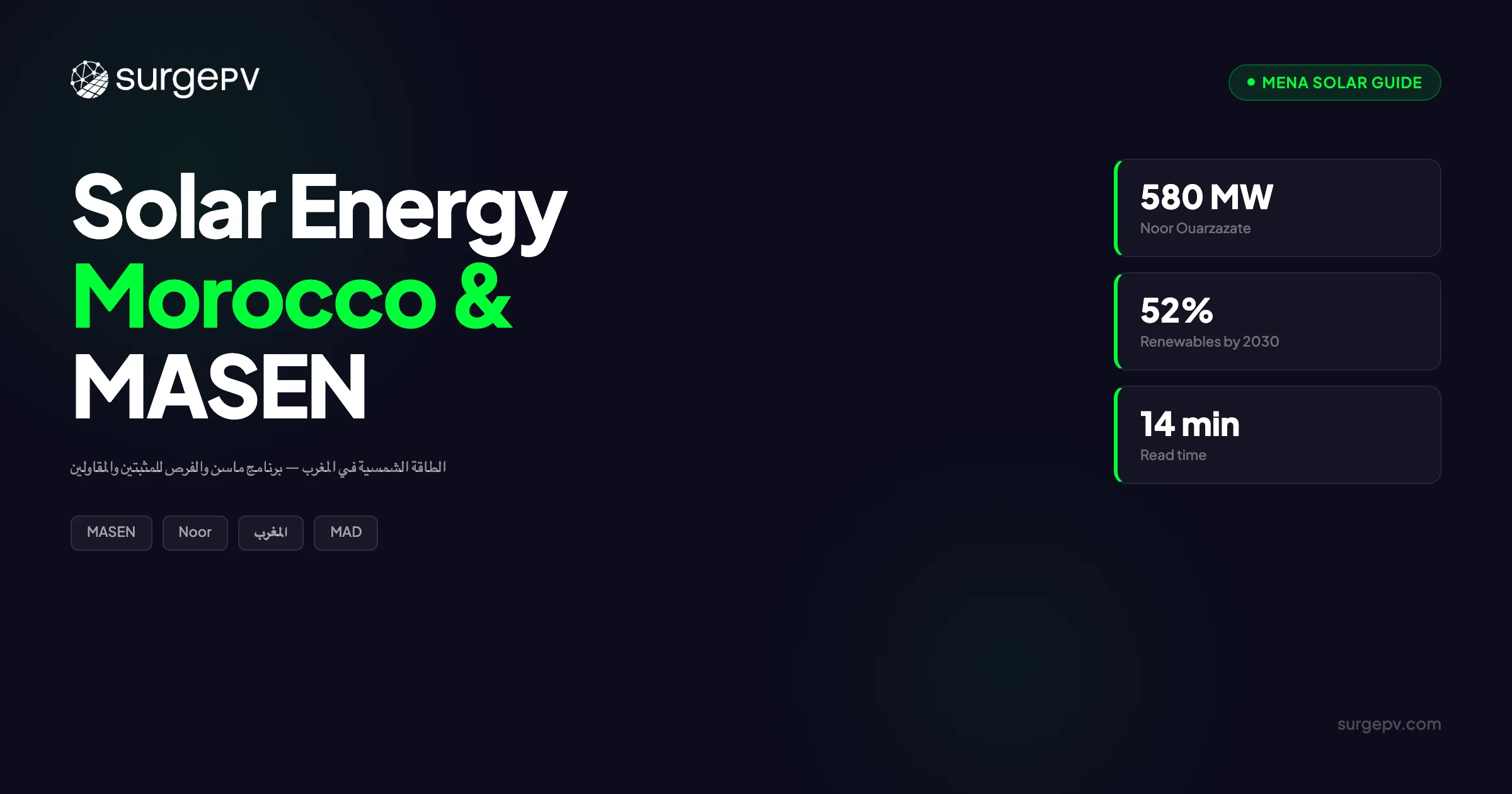 الإشعاع الشمسي بورزازات: 2,635 كيلوواط ساعة/م²/سنة. هدف ماسن: 52% طاقة متجددة بحلول 2030. تعريفة ONEE الصناعية (متوسط الجهد): 0.80–0.95 درهم/كيلوواط ساعة. مدة الاسترداد لنظام سطح 500 كيلوواط في الدار البيضاء: 4–6 سنوات. القطاعات الأسرع نمواً: المناطق الصناعية والفنادق والزراعة.