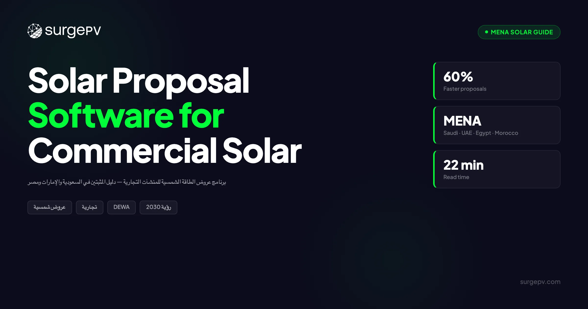 سوق الطاقة الشمسية التجارية في 2026 لا يفتقر إلى الطلب. الأسعار المرتفعة للكهرباء التجارية والتزامات الاستدامة المؤسسية والسياسات التحفيزية الحكومية في المملكة العربية السعودية والإمارات ومصر والمغرب تدفع اهتماماً قياسياً بـ C&I. ما يفتقر إليه السوق هو فرق مبيعات قادرة على تنفيذ عملية العروض التجارية الكاملة — مع المصداقية التقنية والتطور المالي الذي يتطلبه المشترون التجاريون.