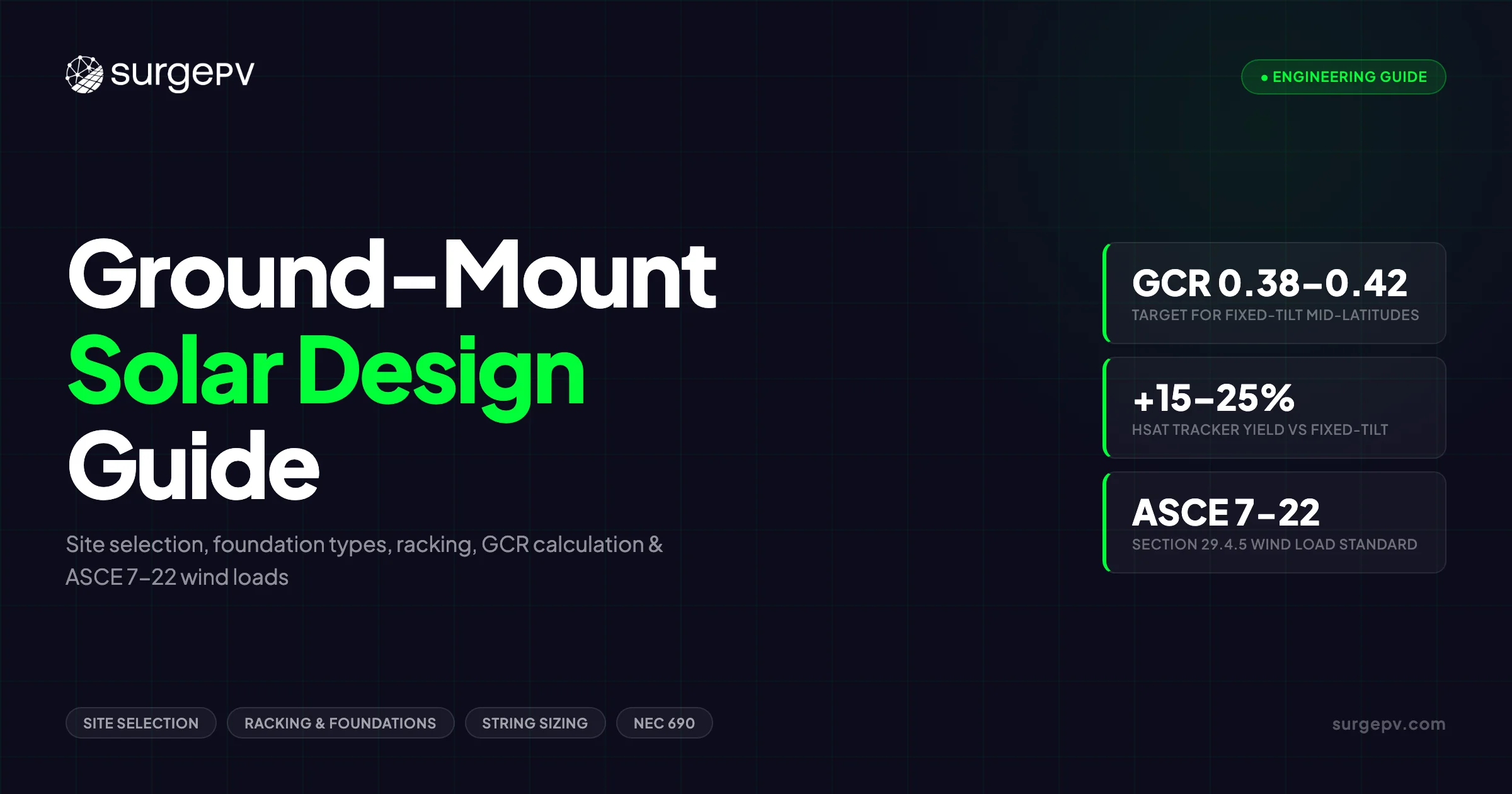 This guide covers the complete ground-mount design process: from the 8 criteria that determine whether a site is viable before you open solar design software, through foundation selection, racking, ground coverage ratio (GCR) calculation, ASCE 7-22 wind loads, string sizing, DC wiring layout, and the permitting checklist. Every section includes worked numbers and actionable rules.