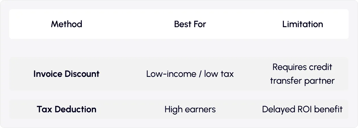 - Invoice discount (sconto in fattura): Immediate cost reduction via installer