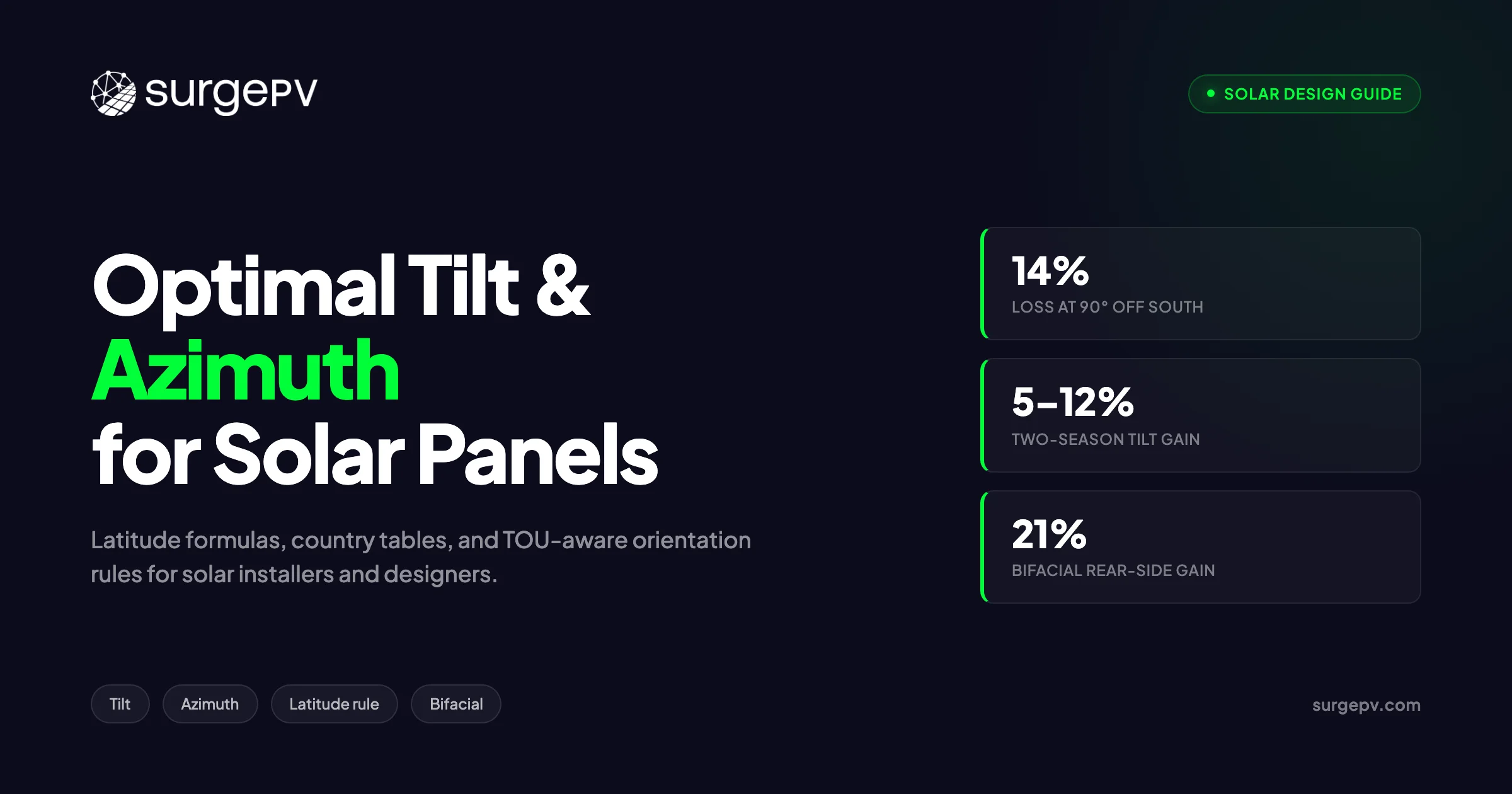 For fixed-tilt systems, start with latitude × 0.76 + 3.1° (25–50° range) or latitude × 0.87 (below 25°). Face true south in the northern hemisphere, true north in the southern hemisphere. Azimuth accuracy matters more than tilt precision — a 90° direction error costs 14–16% of annual output vs. 2–3% for a 10° tilt miss. East-west splits raise self-consumption 15–25% in TOU markets despite lower total kWh. Bifacial panels run 5–15° steeper than monofacial. Snow regions benefit from tilts above 35° but face 2.5× wind uplift above that threshold.