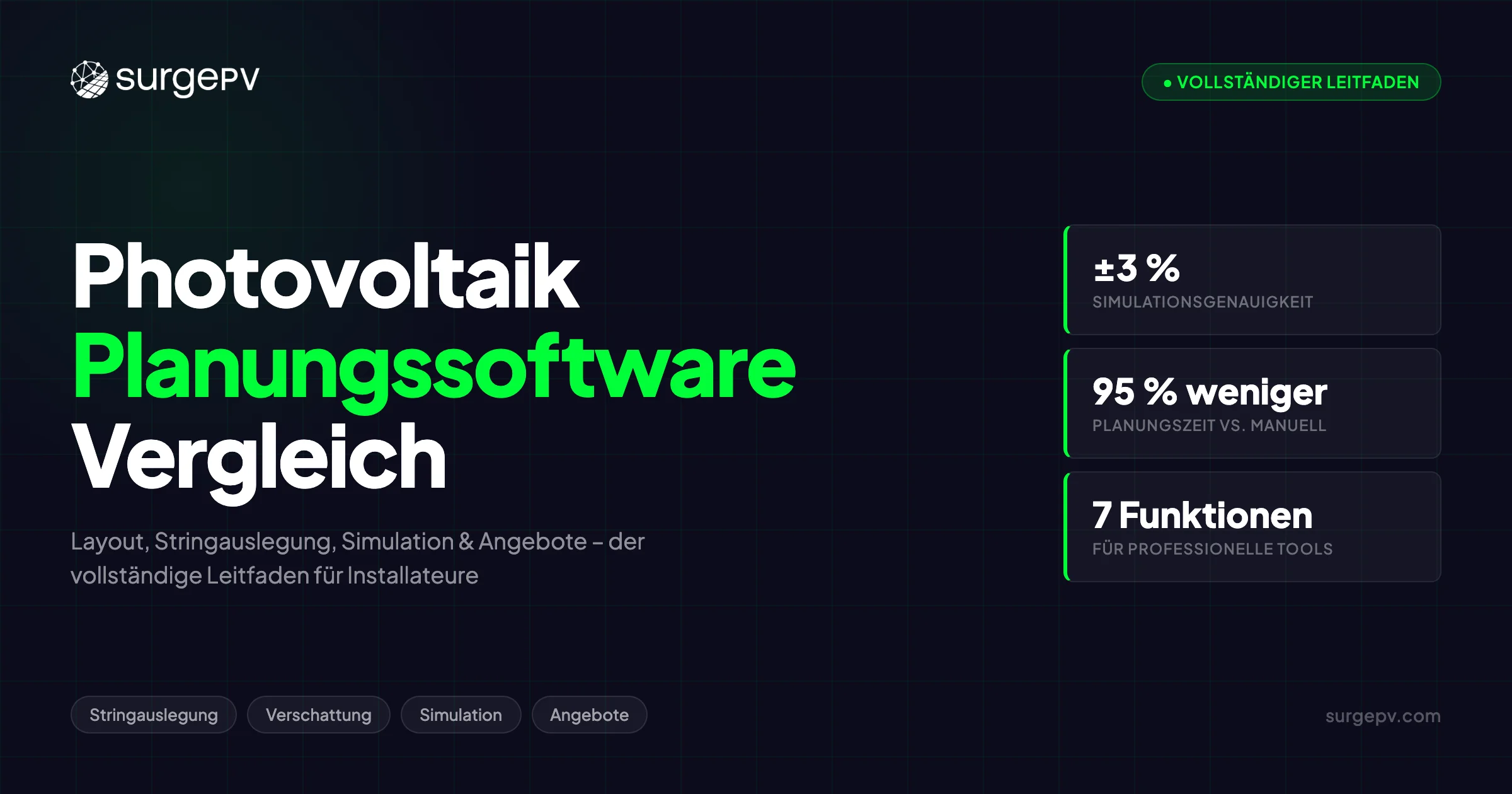 | SurgePV | End-to-End-Installateur-Workflow | KI-unterstützt + LiDAR | Automatisch mit Warnungen | Stündlich zellenbasiert | Vollständig + Förderungen | Gebrandetd, interaktiv | Integriert |