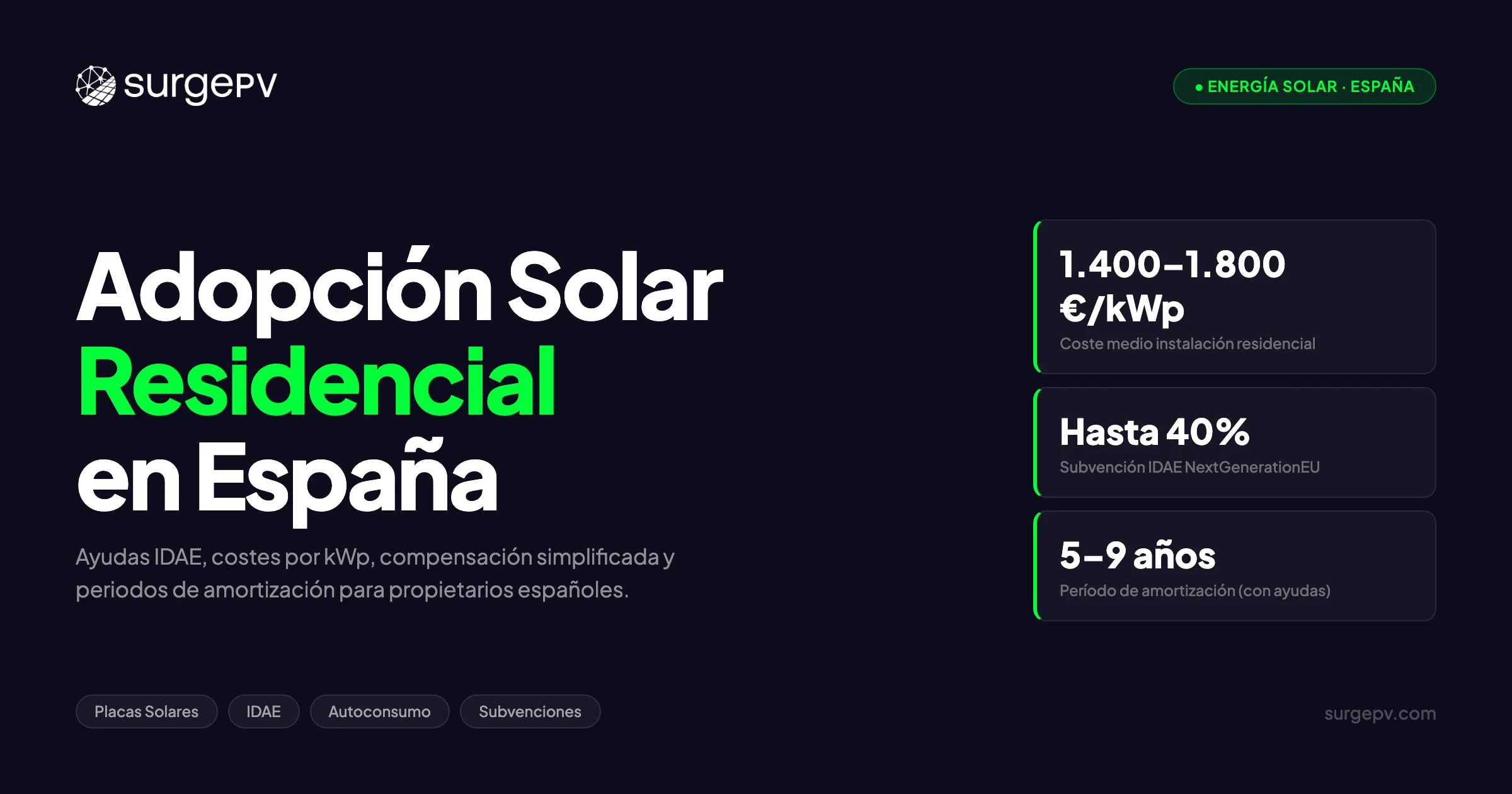 Esta guía abarca todos los aspectos de la energía solar residencial en España en 2026: desde los costes de instalación por kWp y los pasos para solicitar las ayudas del IDAE, hasta la comparación regional de periodos de amortización, deducciones fiscales y cómo los residentes en pisos pueden participar ahora en proyectos de energía solar comunitaria.