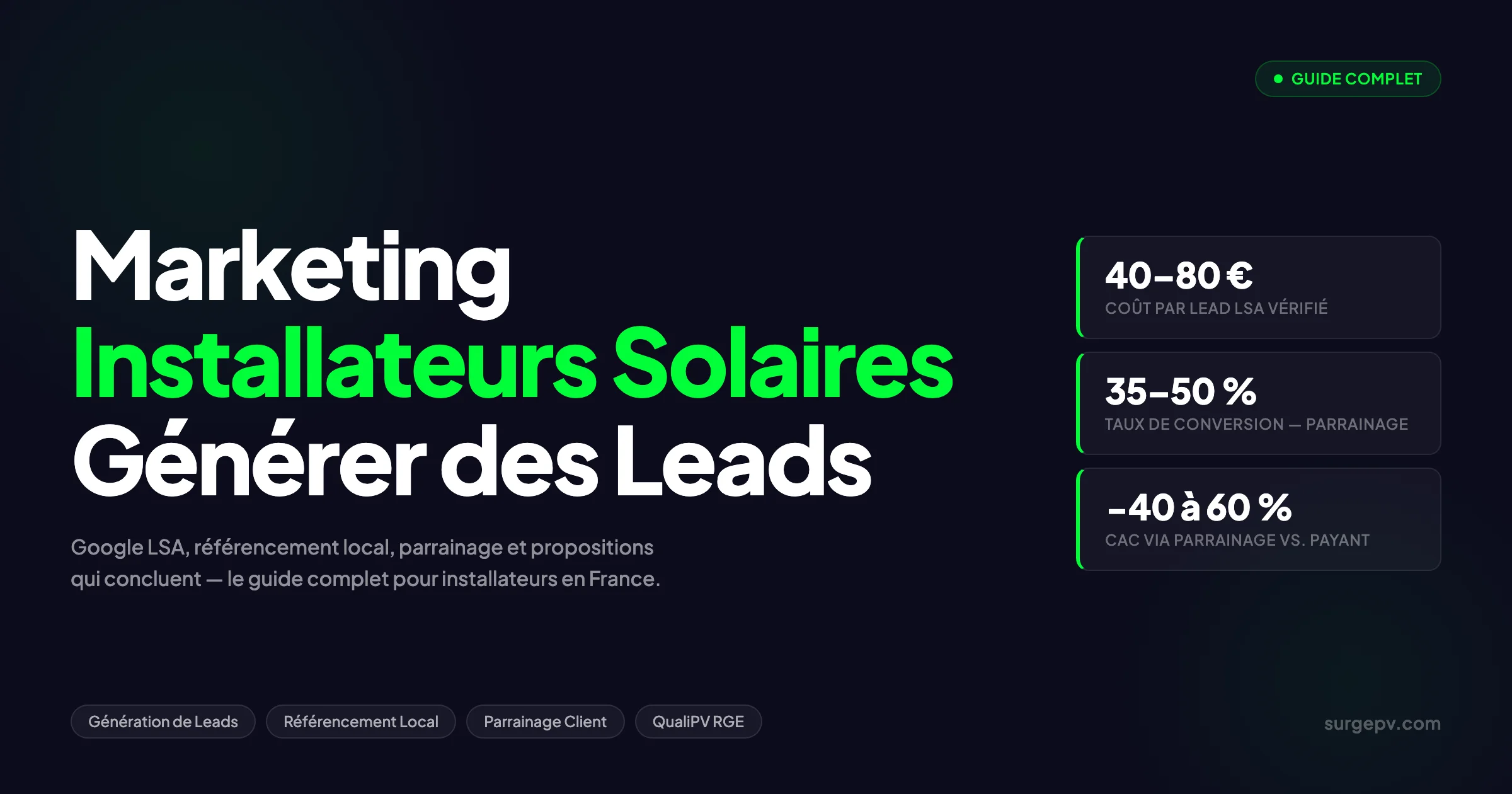 Les canaux marketing solaire les plus performants sont les annonces Google Local Services (40 à 80 € par lead vérifié), les programmes de parrainage (CAC de 180 à 320 € contre 380 à 650 € pour le digital payant), le référencement local pour les termes à l’échelle de la ville, et les propositions professionnelles qui doublent comme outils de vente. La gestion des avis sur Google est incontournable. Le porte-à-porte est en recul mais reste viable dans certains marchés. La vidéo et YouTube sont sous-exploités et offrent un ROI élevé pour les installateurs qui s’y investissent.