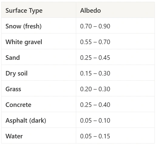 - Snow, light gravel, and white roofs have high albedo; asphalt and vegetation have low albedo.