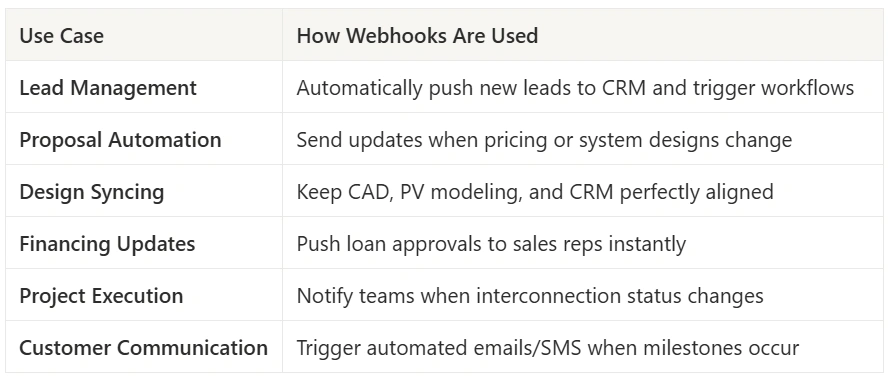 Unlike traditional APIs—which require one platform to “request” data—webhooks push new data automatically the moment an event occurs. This makes them essential for solar companies that want to automate workflows, reduce administrative time, and maintain accurate data across sales, design, proposal, CRM, and project management systems.