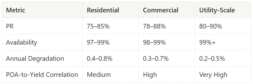 - Core KPIs include Performance Ratio, Specific Yield, Availability, and Capacity Factor.