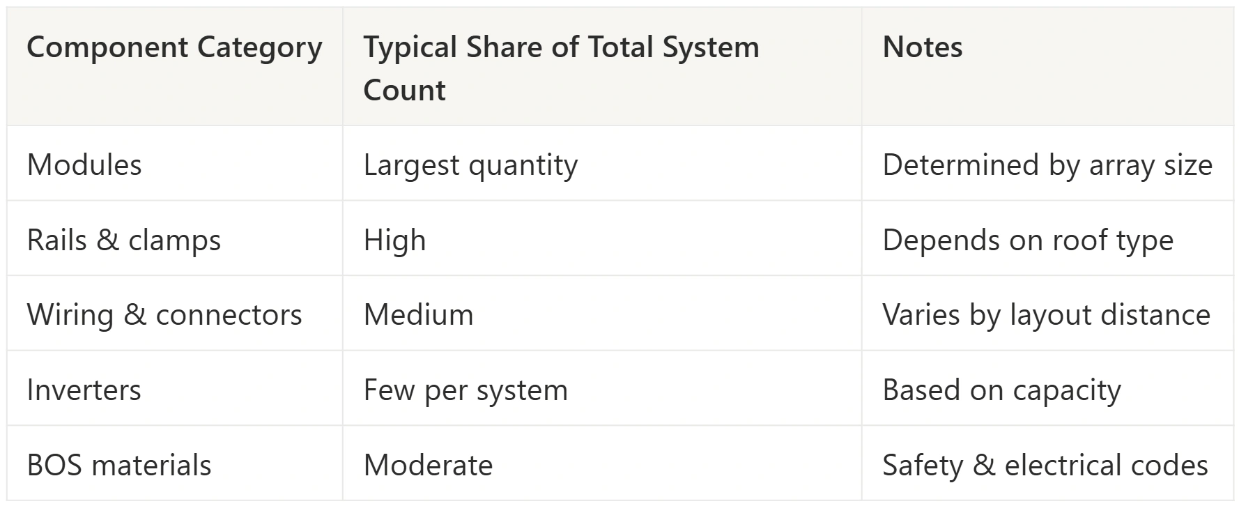 In most residential projects, the BOM includes 20–50 line items, while large commercial systems may include 200+ components.