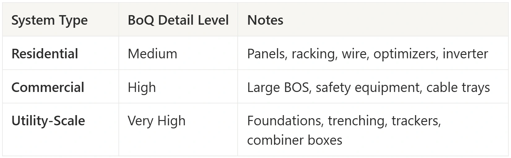 - BoQs differ by project size—residential, commercial, and utility-scale.