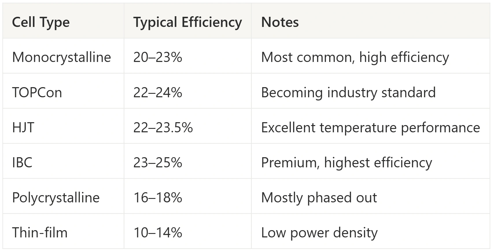 - Efficiency varies by technology (Mono, TOPCon, HJT, IBC, etc.).