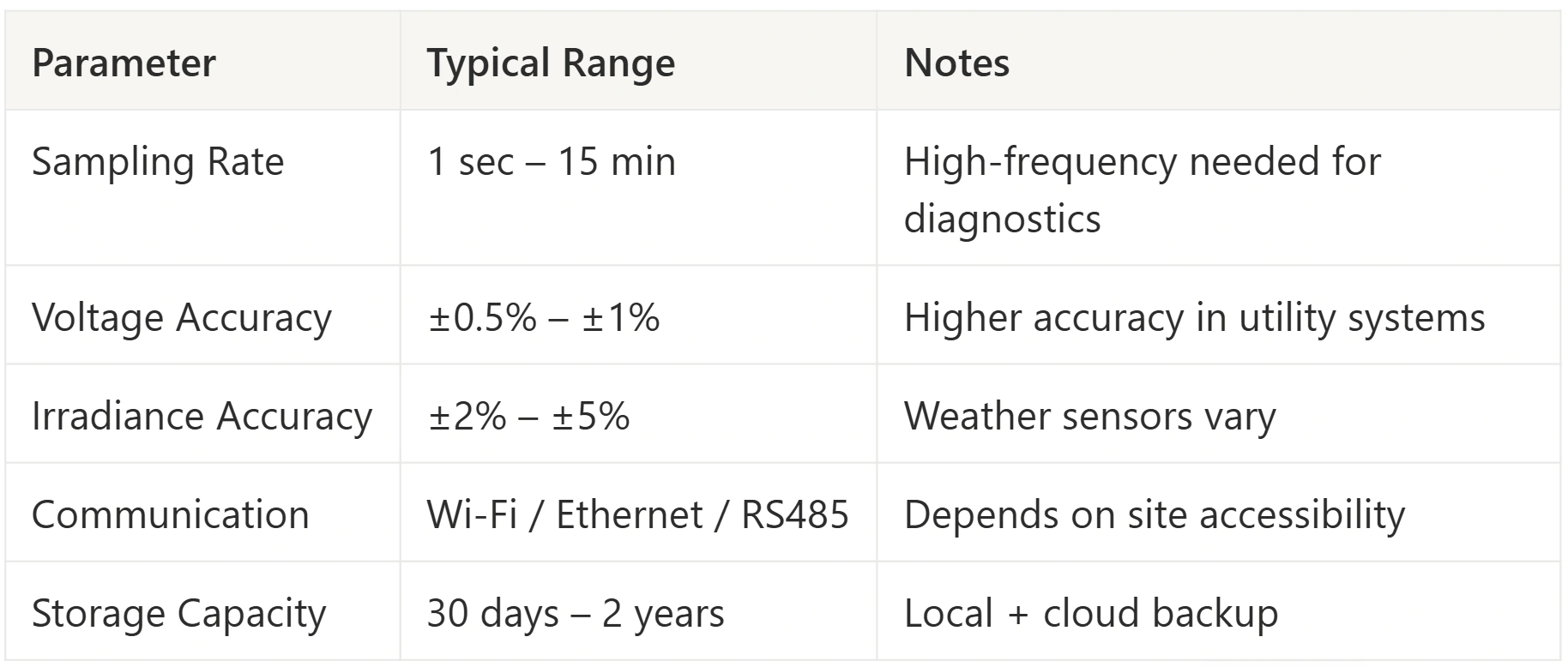 Residential systems may only need inverter-integrated logging; utility systems need SCADA-grade instruments.