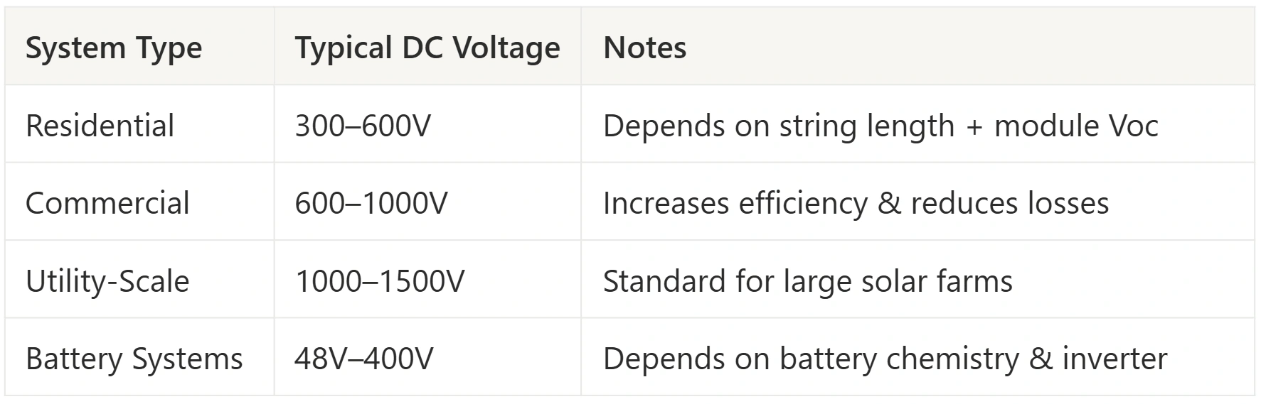 Common in commercial and utility-scale solar installations (e.g., 1000V or 1500V systems).