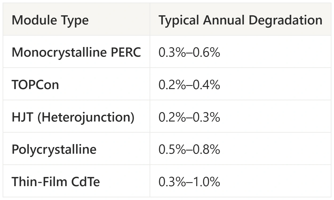 - Most modern panels degrade 0.2%–0.6% per year, depending on technology.