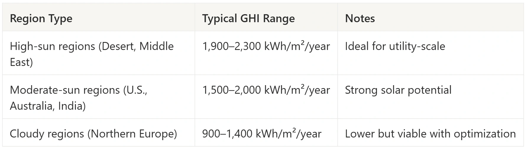 Because it reflects real-world weather conditions, cloudiness, pollution, and atmospheric scattering, GHI is a primary determinant of energy production potential.