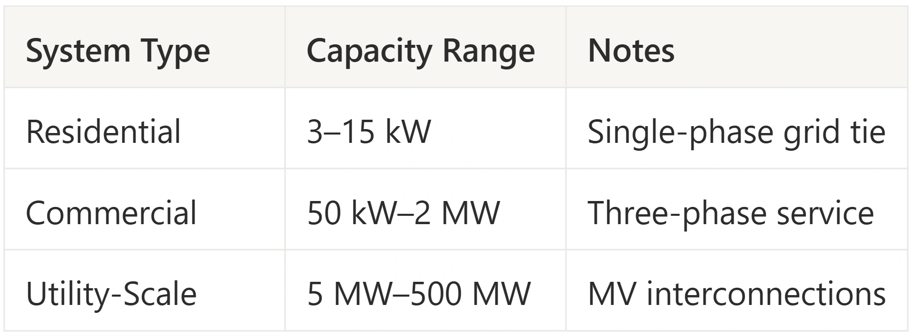 Common grid voltages: 120/240V (residential), 208V, 400V, 480V (commercial), 12–35kV (utility).
