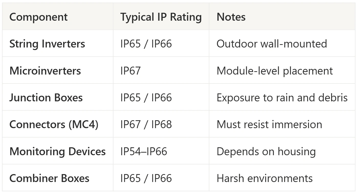 - IP65–IP67 is standard for inverters, junction boxes, and connectors.