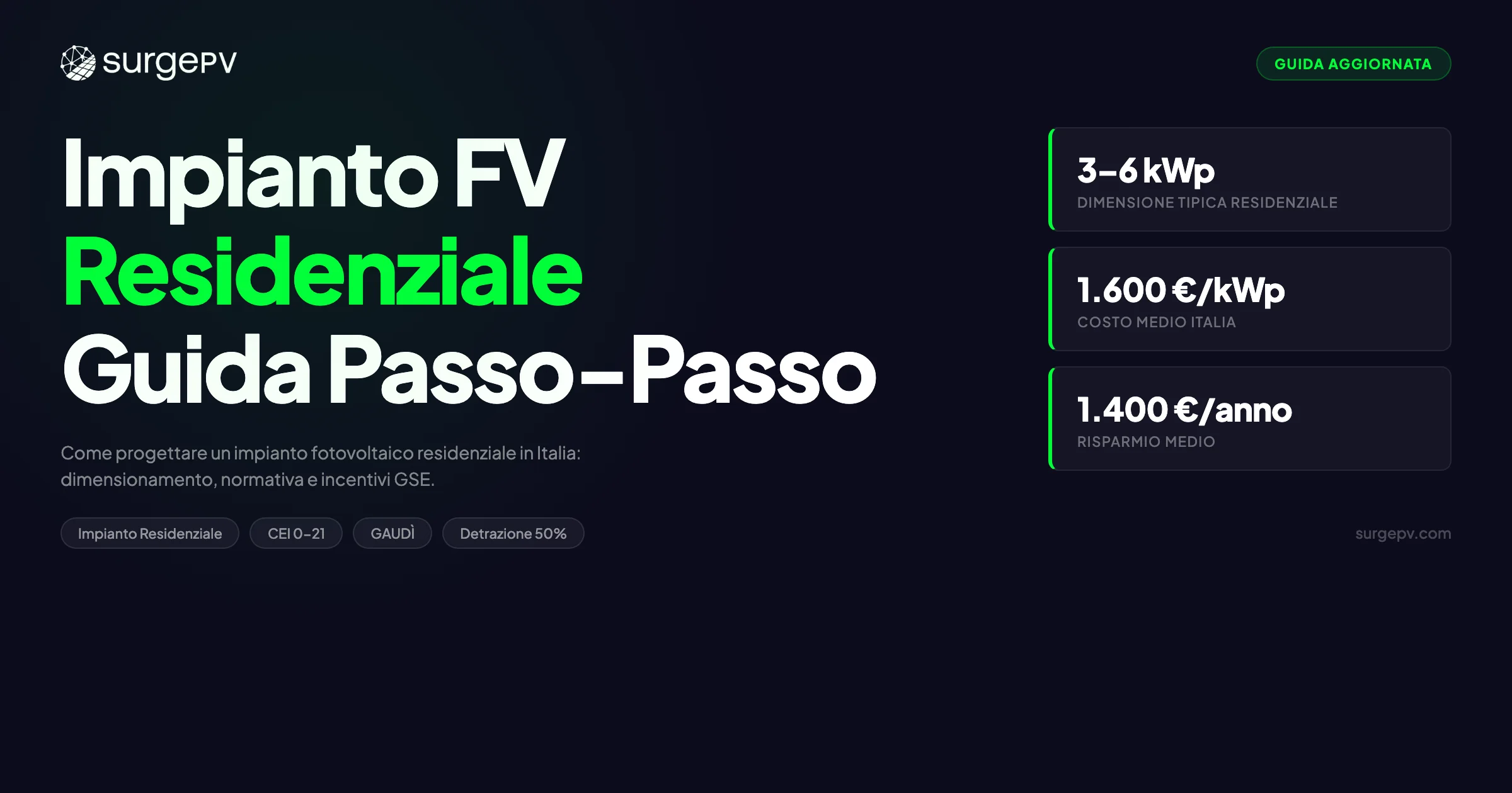 La progettazione di un impianto fotovoltaico residenziale segue 12 fasi sequenziali. La formula di base è semplice: dividi il consumo annuo in kWh per il fattore di resa della località (kWh/kWp/anno) per ottenere la potenza richiesta in kWp. Una casa tipica italiana necessita di 3-6 kWp. Ogni fase successiva — scelta dei pannelli, layout, abbinamento dell’inverter, configurazione delle stringhe, simulazione — affina il progetto verso un impianto realizzabile e pronto per le pratiche burocratiche. Strumenti come SurgePV automatizzano la maggior parte di questi passaggi, trasformando un processo manuale di più giorni in un risultato consegnabile in giornata.