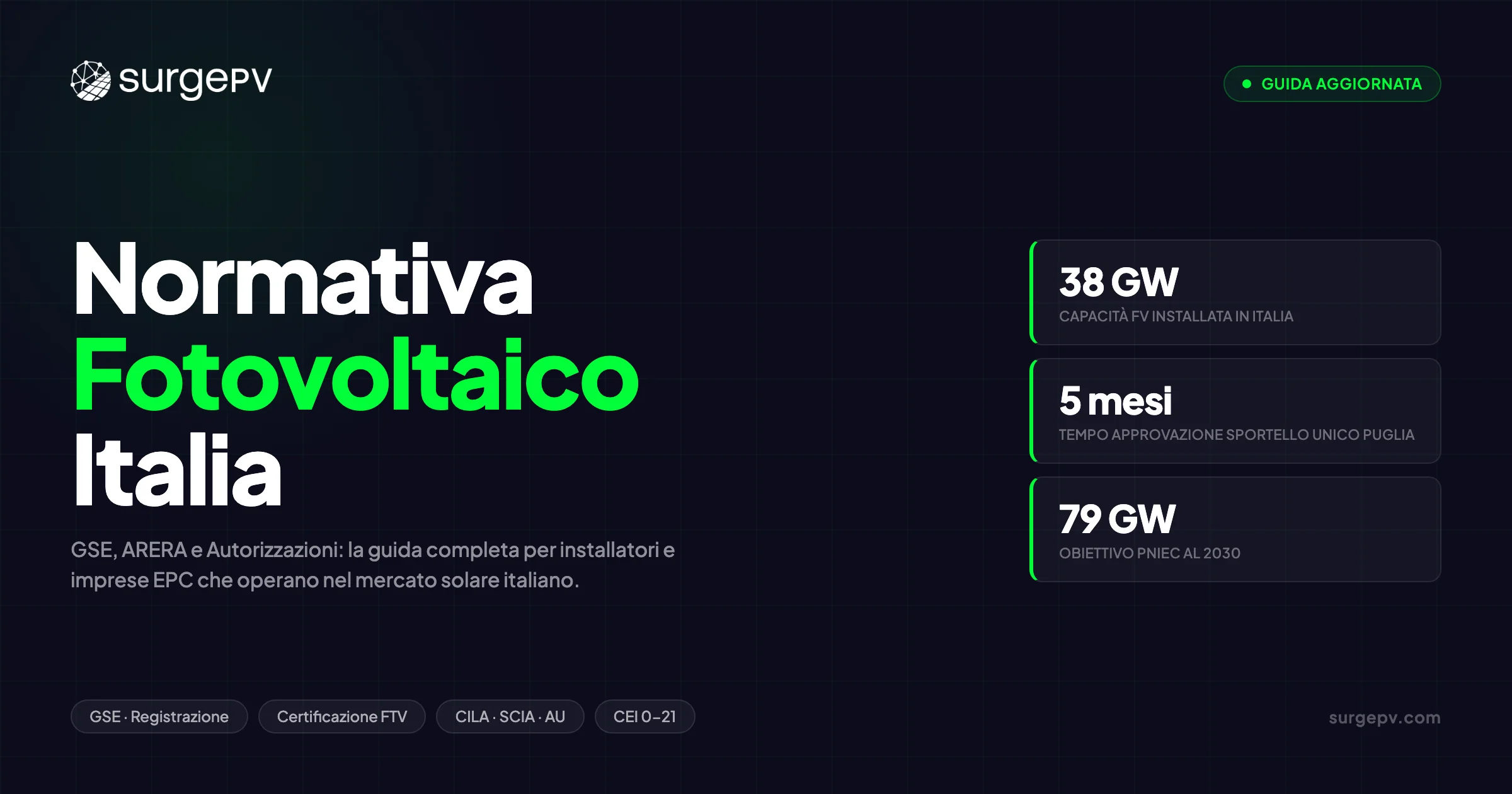 Il settore solare italiano ha registrato una crescita straordinaria negli ultimi quattro anni — da circa 22 GW di capacità fotovoltaica installata nel 2021 a un dato stimato di 38 GW entro fine 2025, con il governo che punta a 79 GW entro il 2030 nell’ambito del PNIEC aggiornato (Piano Nazionale Integrato per l’Energia e il Clima). Per le imprese solari che operano in questo mercato, il quadro di crescita è promettente. Ma dietro ogni megawatt installato si nasconde una fitta rete di requisiti autorizzativi, categorie di permesso, protocolli di connessione alla rete, regole di registrazione al GSE e standard tecnici che possono bloccare un progetto se non gestiti correttamente.