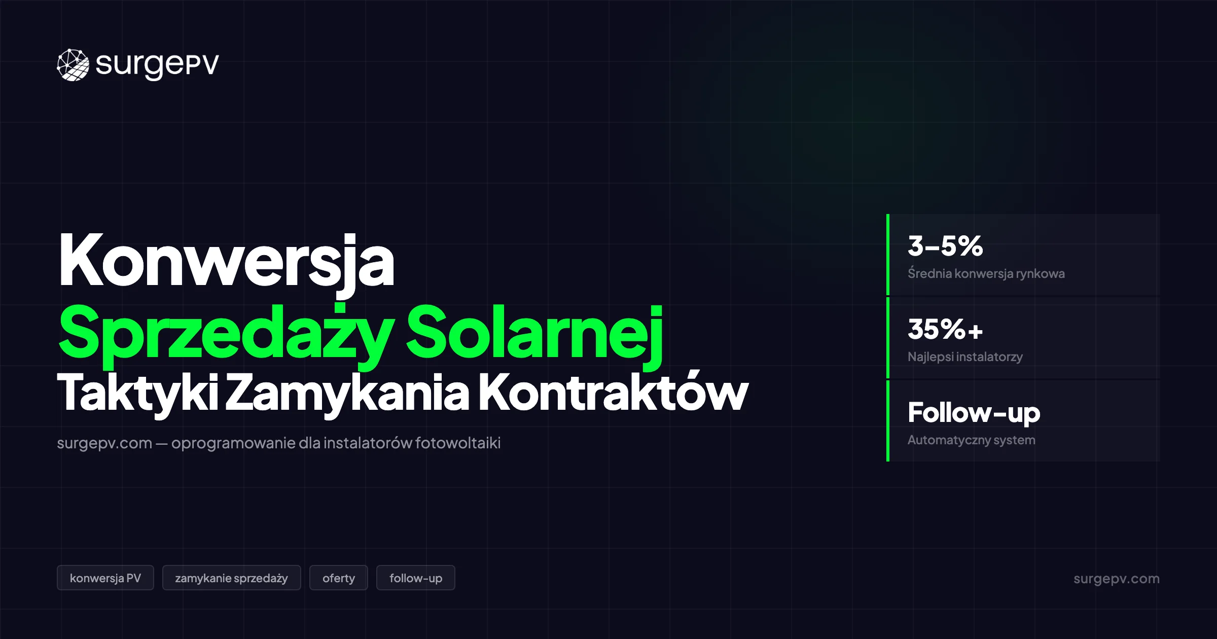 Główne dźwignie konwersji się nie zmieniły. Szybkość, konkretność i dyscyplina follow-up nadal wygrywają transakcje. Co się zmieniło — to poprzeczka. Kupujący w 2026 r. widzieli więcej ofert solarnych niż kiedykolwiek, co oznacza, że ogólne szablony i powolna realizacja przegrywają szybciej niż kiedyś.