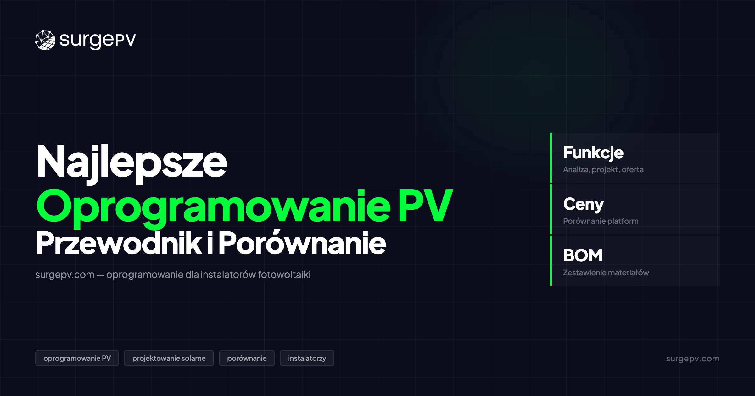 Ten przewodnik obejmuje pełny obraz sytuacji na 2026 rok: co oceniać w każdej platformie do projektowania PV, tabelę porównawczą wiodących narzędzi, szczegółowy przegląd możliwości SurgePV, rzetelne uwagi o konkurencji i framework do dopasowania oprogramowania do Twojego typu działalności — niezależnie od tego, czy jesteś jednoosobowym instalatorem mieszkaniowym, czy wielonarodową firmą EPC.